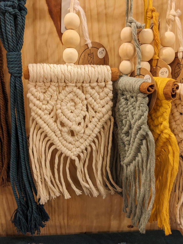 Suspension décorative en macramé à partir d'un support naturel et hivernal en bâton de cannelle.