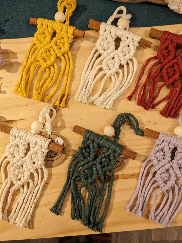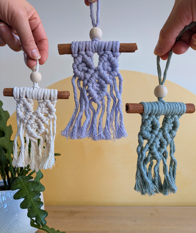 Suspension décorative en macramé à partir d'un support naturel et hivernal en bâton de cannelle.